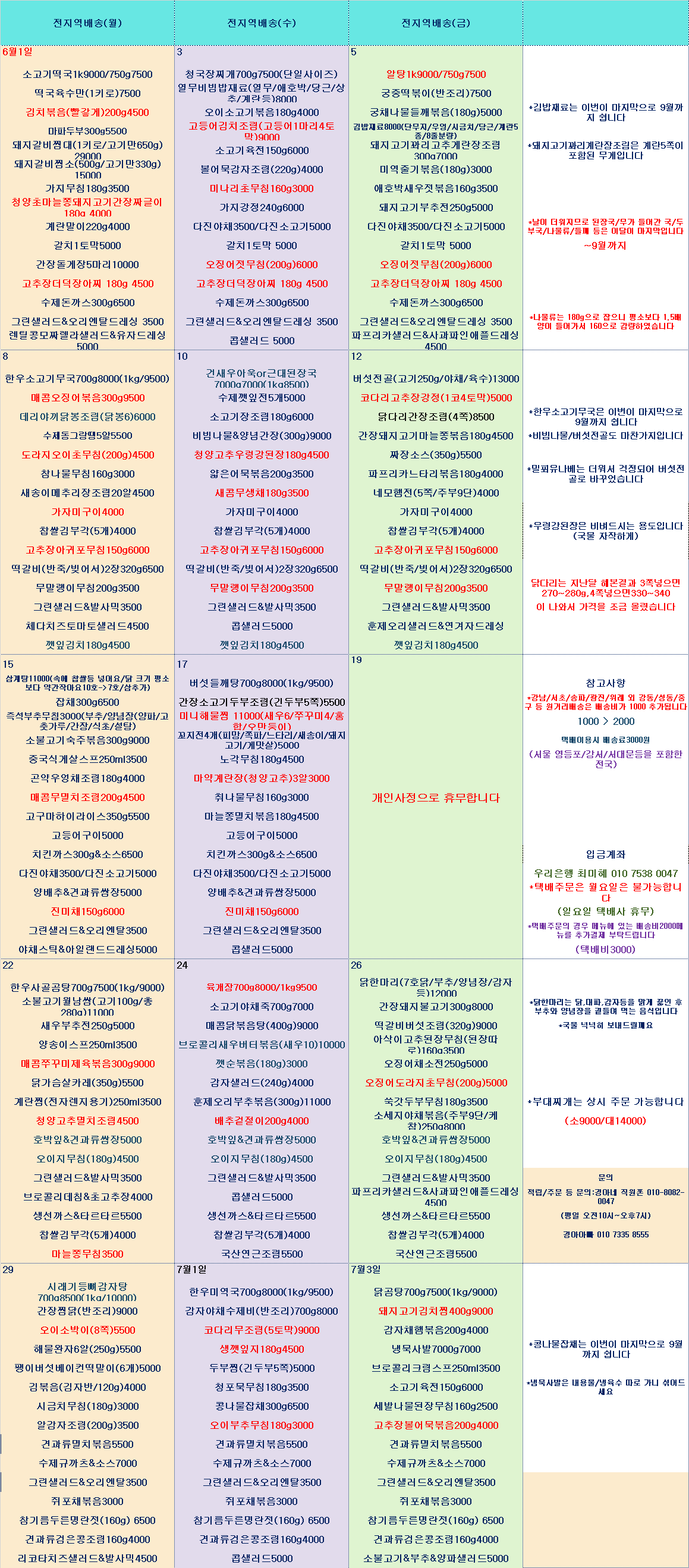 안녕하세요? 식단이 늦어 죄송합니다. 일정 조절할것들이 있어 좀 늦었네요;;; 다음달은 6/19(금) 휴무합니다 참고 부탁드릴께요 ^^ 이제부터 더워져서 저희도 최대한 빨리 식혀 안전하게 포장하겠지만, 가정에서도 받으신 후 바로 냉장/냉동보관 해주시길 부탁드립니다 국은 당일에 안드실 경우는 냉동보관 해주시고 아침에 드시고 저녁에 또 드실경우는, 한번 끓였다 식힌 후 냉장보관 부탁드립니다 다음달부터는 나물류,두부나 된장국류, 무와 들깨가 들어간 것들은하지 않을 예정입니다 ㅠㅠ 문의사항 : 010 8082 0047 (고객센터 : 오전10시~오후7시)입니다 감사합니다. |