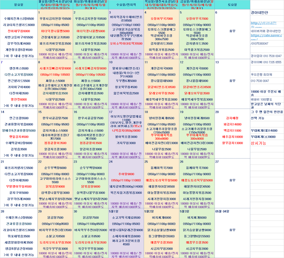 4월은 총5주간 입니다 ^^ 4월부터 반찬마다 조금씩 계량을 해서 식단에 표시하도록 하겠습니다 4월은 토요일 특별식을 없에보고 수요일에 특별한 메뉴들로 짜보았습니다 4월 월정기식 이벤트 : 한번에 총 6회이상 신청시 해당됩니다 -신규 월정기식 신청시 : 식단 맨 앞칸(일요일칸)의 반찬1가지 -연장 월정기식 신청시 : 식단 맨 앞칸(일요일칸)의 반찬2가지 -현금결제시 : 식단 맨 앞칸(일요일칸)의 반찬1가지 -> 서비스반찬은 홈페이지 메모란에 써주시거나 까페에 댓글로 남겨주세요 ^^ -> 카드결제는 되도록 홈페이지에서 부탁드립니다 ^^ ->드시고 싶으신 반찬만 주문하시면 되고, 18000원 이상 주문시에 배송가능합니다 꾸벅 ->배송비1천원이 있습니다(홈페이지 상에서는 자동계산됩니다) 배달지역을 확인하고 주문해주세요^^ 서초/내곡/강남(도곡,역삼,삼성,청담,논현,반포,잠원,대치,양재,등 등) /광진/잠실,방이,석촌/풍납 => 매주 월,수,목요일 주문가능 송파/위례/강남(수서,세곡,자곡,율현,일원) => 매주 화,수,금요일 주문가능 |