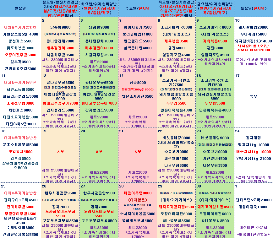 안녕하세요 경아네입니다. 11월 식단이 나왔어요 보시고 주문해주세요 ^^ 그리고 소가족식 반찬 바꾸기를 원하시는 분들이 많으셔서 고민을 하고 있는데 프로 그램 개발자분께 의뢰를 해둔 상태입니다. 그리고 한번에 한달 주문을 다 할수 있게 의뢰를 해두었습니다. 홈페이지를 좀더 편하게 할수 있게 개선하겠습니다. 날씨가 추우니 감기 |